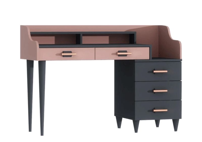 Модулната структура включва едно рафтче и цели пет чекмеджета, което гарантира оптимална организация на документи, принадлежности и аксесоари. Работният плот с размер 100 × 48 см осигурява достатъчно пространство за компютър, периферия и всичко необходимо за продуктивен ден.
