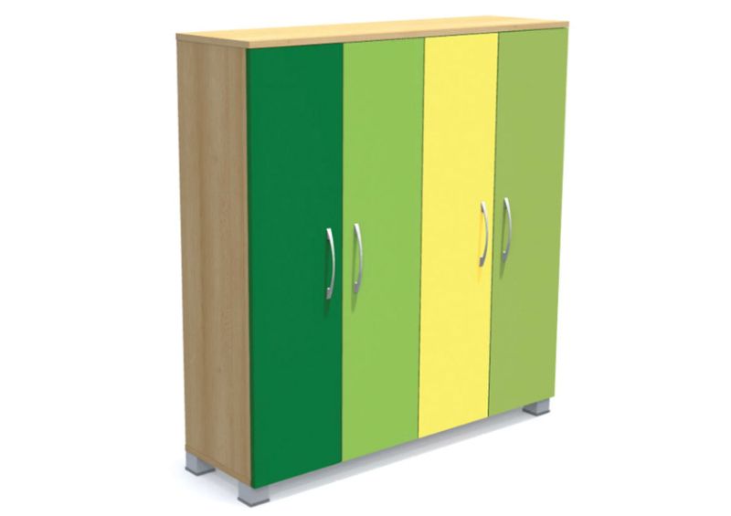 Функционален гардероб с четири врати, създаден за удобно и подредено съхранение на дрехи и лични вещи в офиси, учебни заведения, обществени пространства или дома. Моделът комбинира изчистен външен вид с надеждна конструкция, подходяща за ежедневна употреба.